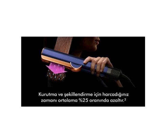 Dyson Airstrait™ Saç Düzleştirici Islaktan kuruya, havayla düzleştirme. Aşırı ısı ve sıcak plakalar olmadan.1 Güçlü, yönlendirmeli hava akımıyla saçı hizalar. Kurutma ve şekillendirme için harcadığınız zamanı ortalama %25 oranında azaltır.2 Kutu İçeriği Kaydırmaz ısı matı Saklama Kutusu Akıllı hava akımı Makineniz saçın kolların arasında olduğunu algılar ve saçınız kolların arasında olmadığında daha sessiz, daha verimli şekillendirme için otomatik olarak düşük hava akımına geçer. LCD ekran Yüksek çözünürlüklü renkli ekran, şekillendirme sırasında kolayca görülmesi için hava akımını ve sıcaklık ayarlarını gösterir. Islak mod ve Kuru mod Islak saçı havayla düzleştirerek saçın parlaklığını artırın ve ısı kaynaklı hasarı azaltın. Ya da iki yıkama arasında, kuru saçta stilinizi yenileyerek saçınızın parlaklığını aşırı ısı olmadan koruyun. Otomatik duraklama Üç saniye hareketsiz kaldıktan sonra makineniz otomatik olarak duraklayacaktır. Hava akımını yeniden başlatmak için makineyi hareket ettirmeniz yeterlidir.