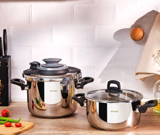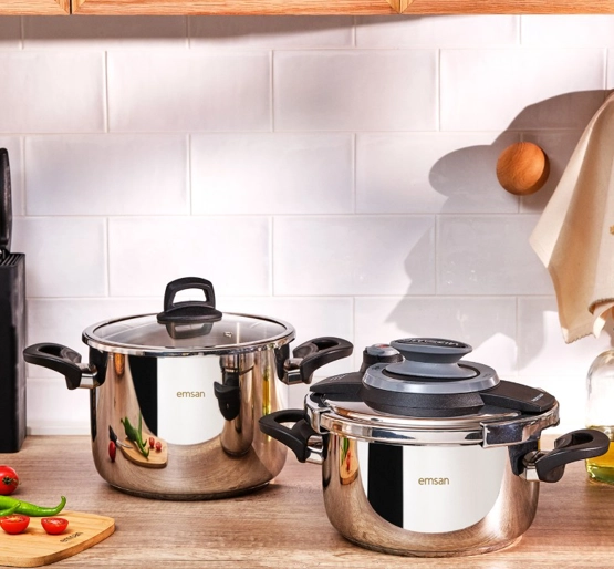 Emsan Montana İndüksiyon Tabanlı Düdüklü Tencere Seti Siyah Gri 4+6 Litre 18/10 paslanmaz çelik İndüksiyon dahil tüm ocaklarda kullanıma uygun enerji kapsül taban. Yanmayan ve ısınmayan bakalit yan saplar. 4 ve 6 litreden oluşan 2 farklı gövde. 2 tencere de kullanılabilen düdüklü kapak. 2 tencere de kullanılabilen cam kapak. 2 tencereye de uyumlu kullanılabilecek gibi tasarlanmış düdüklü kapak ve cam kapak sayesinde 2 farklı düdüklü ve 2 farklı tencere olarak kullanılabilir. Düdüklü kapağı hariç olarak diğer parçalar bulaşık makinesinde yıkanmaya uygundur. Ölçü: 4 lt (22 x 12,5 x 12 cm) 6 lt (22 x 17 x 16,5 cm) Ürünün alt tabanında emsan logosu vardır.