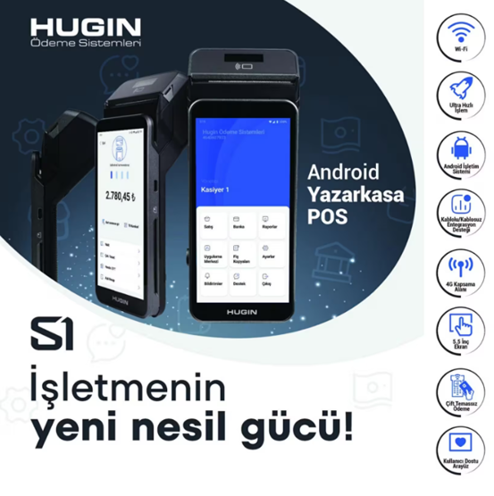 İşletmenizin ihtiyacı olan hız ve teknoloji, Hugin S1 ile yeniden tanımlanıyor. Sadece bir yazar kasa değil, işletmenizi geleceğe taşıyan akıllı bir terminal olan Hugin S1; Android 12 işletim sistemi, dört çekirdekli yüksek performanslı işlemcisi, ergonomik tasarımı ve kullanıcı dostu arayüzü ile satış süreçlerinizi kusursuzlaştırıyor. Öne Çıkan Üstün Özellikler • Yüksek Performans: Dört çekirdekli işlemci ve Android 12 ile takılmadan, en hızlı işlem deneyimi. • Gelişmiş Ekran: 5,5 inç boyutunda, 720x1440 çözünürlüklü IPS kapasitif çoklu, geniş dokunmatik ekran. • Çift Temassız Ödeme Özelliği: Hem kullanıcı hem de müşteri ekranından temassız ödeme alabilme imkanıyla kolay ve hızlı işlem. • Kesintisiz Bağlantı: 4G LTE, Wi-Fi ve Bluetooth seçenekleri ile her an, her yerde satış yapma özgürlüğü. • Güçlü Batarya: Mobil kullanım için tasarlanmış 5000 mAh yüksek kapasiteli bataryası ile yoğun iş günlerinde yarı yolda kalmazsınız. • Hafif ve Ergonomik: Sadece 360g ağırlığıyla gün boyu konforlu kullanım sağlar. Esnek Ödeme Seçenekleri • Çok Yönlü Ödeme: Temassız (NFC), manyetik kart, akıllı kart ve Kare Kod (QR) ile ödeme yöntemlerini destekler. • Faturalı İşlem Kolaylığı: Cihaz üzerinden kredi kartı çekimi yapabilir, ayrıca oluşturduğunuz fatura bilgilerini girerek bilgi fişi alabilirsiniz. Hugin S1 Android Yazar Kasa POS ile işletmenize hız katın, teknolojiyle tanışın!