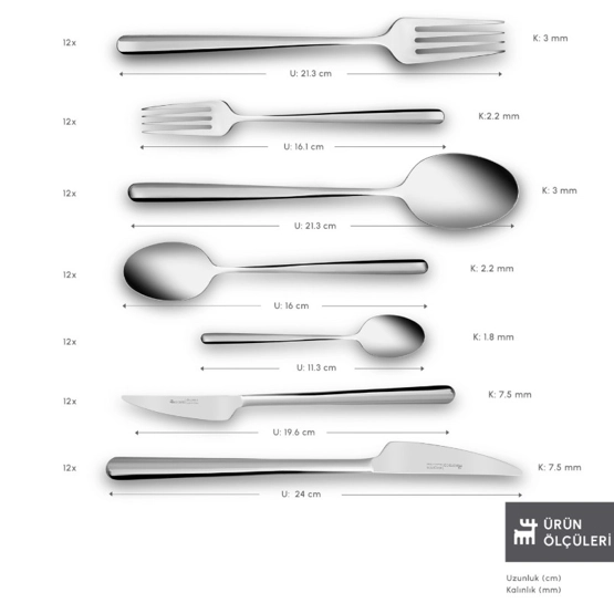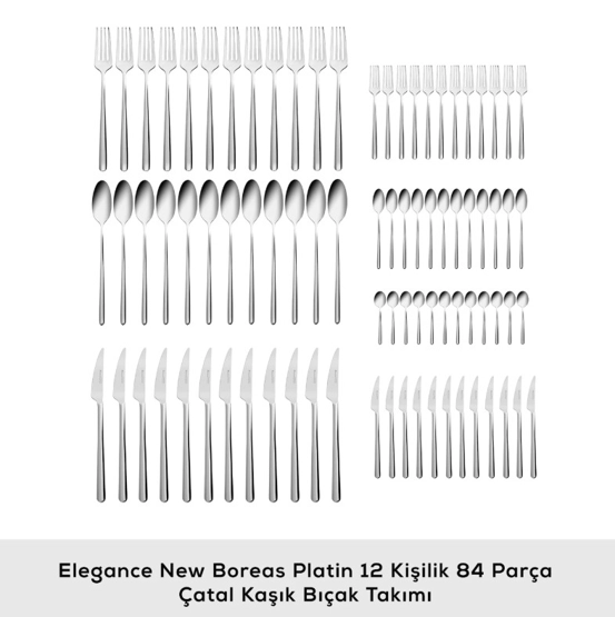 Karaca Elegance New Boreas Platin 12 Kişilik 84 Parça Çatal Kaşık Bıçak Takımı 12 adet Yemek Kaşığı 12 adet Yemek Çatalı 12 adet Yemek Bıçağı 12 adet Tatlı Kaşığı 12 adet Tatlı Çatalı 12 adet Tatlı Bıçağı 12 adet Çay Kaşığı