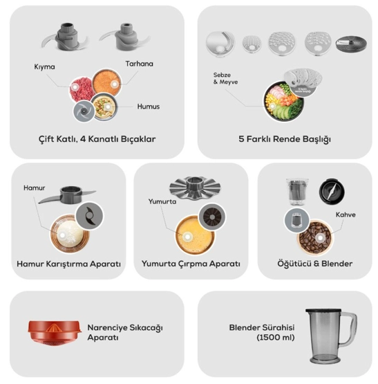 Karaca Mastermaid Power Max 11 in 1 2500W Mutfak Robotu Özellikler 2500W motor gücü ile en hızlı şekilde istediğiniz formda gıda işleme performansı sağlar. 1500 ml Ilkgeniş hazneli ile 1,5 kg domates' tek seferde çekebilirsiniz.11 farklı aparatı ile doğrama, karıştırma, öğütme, rendeleme, dilimleme, yoğurma, çırpma ve narenciye sıkma fonksiyonlarının hepsini bir arada sunar. Tüm özellikleri tek bir üründe yaparak, mutfağınızda yer kazandınr. Çift katlı, 4 kanatlı doğrayıcı bıçaklan üstün doğrama performansı sağlar. Böylelikle humus, salça, kıyma ve tarhana gibi yiyeceklerinizi hızlıca hazırlayabilirsiniz. 1000 ml hazneli blender sürahi ile pürüzsüz karışımlar hazırlarken, buz kırma özelliğiyle de soğuk içeceklerinizi de kolaylıkla hazırlayabilirsiniz. Öğütücü aparatı ile kahve ve baharatları damak tadın ıza göre farklı seviyelerde çekebilirsiniz. Yumurta çırpma aparatı ile tarifiniz için gerekli yumurtaları kabartabilirsiniz. Hamur yoğurma aparatı ile kısa sürede homojen hamurlar elde edebilirsiniz. 5 farklı paslanmaz çelik rende başlığı ile meyve, sebze ve sert peynirleri farklı şekillerde dilim ve rendeleyebilirsiniz. Kaydırmaz ayakları sayesinde çalışma esnasında gövde stabil kalır. Aparatları bulaşık makinesinde yıkanabilir ve pratik şekilde sökülüp takılabilir. Ek Özellikler Hız Kademeleri aparatların renkleri ile eşleştirilmiştir. Renk hız eşleşmeleri sayesinde her seferinde aparat için en doğru hız ayarını yapmanızı sağlar; 1.Kademe hamur yoğurma, yumurta çırpma ve narenciye sıkma işlemleri için en uygunudur. 2.Kademe sebze doğrama, kıyma çekme, humus hazırlama gibi işlemler için en uygunudur. Hazneleri BPA içermez