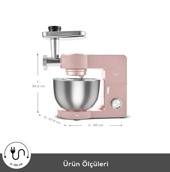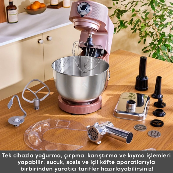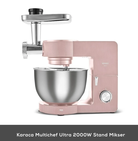 Karaca Multichef Ultra 2000W 7 Litre Stand Mikser Rosegold (Kıyma Çekme/Sucuk-Sosis/İçli Köfte Aparatlı) Karaca MultiChef Ultra 2000W Stand Mikser, mutfaktaki tüm ihtiyaçlarınızı karşılamak için tasarlandı. 2000W gücündeki ekstra güçlü motoru sayesinde çırpma, karıştırma ve yoğurma işlemlerini zahmetsizce yapabilirsiniz. Üstelik kıyma çekme, sucuk ve sosis hazırlama, içli köfte yapımı gibi farklı fonksiyonları sayesinde yemek hazırlıklarınızı kolaylaştırır ve çeşitlendirir. Yörüngesel hareket özelliği ile yumurta çırpmadan sos hazırlamaya, ekmek yoğurmadan kek yapımına kadar her işlemde kusursuz sonuçlar elde edersiniz. 7 litre kapasiteli geniş paslanmaz çelik haznesi, dayanıklı metal iç aksamları ve sıçrama önleyici şeffaf kapağıyla temiz, pratik ve uzun ömürlü bir kullanım sunar. 6 kademeli hız ayarı ve pulse fonksiyonu ile her tarifinize uygun hızda çalıştırabilir, ihtiyacınıza göre kontrol sağlayabilirsiniz. Modern suni deri görünümlü tasarımıyla hem şıklık hem de fonksiyonellik arayanlar için ideal bir seçimdir. Karaca MultiChef Ultra, mutfakta işlerinizi kolaylaştırmak ve yemek yapmayı keyfe dönüştürmek için yanınızda! 2000W ekstra güçlü motor Kıyma çekme aparatı Sucuk ve sosis hazırlama aparatı İçli köfte aparatı Yörüngesel hareket özelliği 7 litre paslanmaz çelik hazne Sıçrama önleyici şeffaf kapak 6 kademeli hız ayarı + pulse fonksiyonu Dayanıklı metal iç aksamlar Suni deri görünümlü dış tasarım