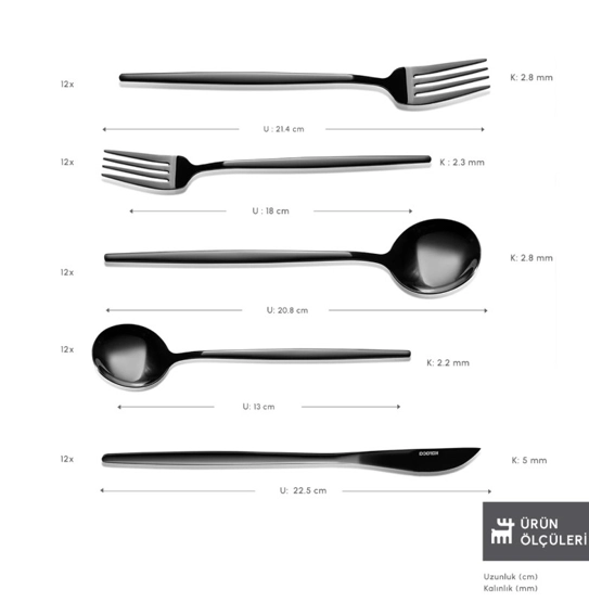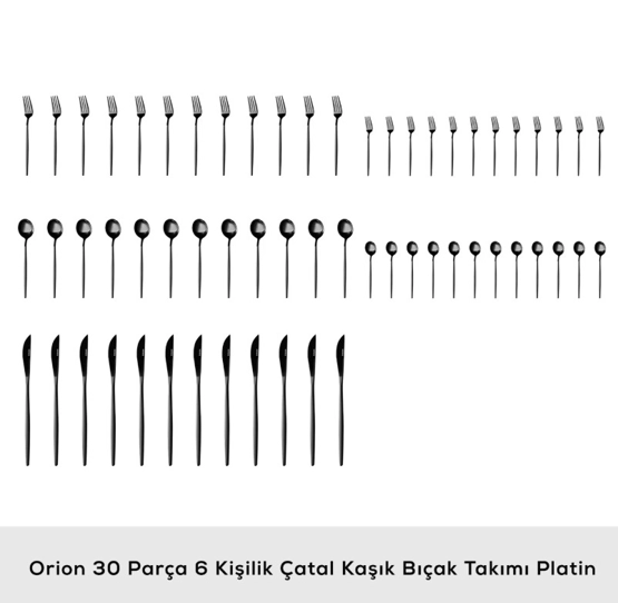Karaca Orion 30 Parça 6 Kişilik Çatal Kaşık Bıçak Takımı Black Set İçeriği 6 Adet Yemek Bıçağı (22.5 cm) 6 Adet Yemek Kaşığı (21 cm) 6 Adet Yemek Çatalı (21.5 cm) 6 Adet Tatlı Çatalı (18 cm) 6 Adet Çay Kaşığı (13 cm) Malzeme: Çelik Özellikler Elde yıkanması tavsiye edilir.
