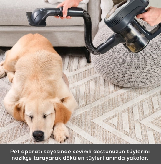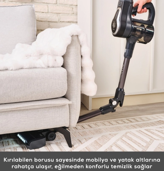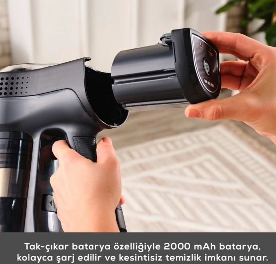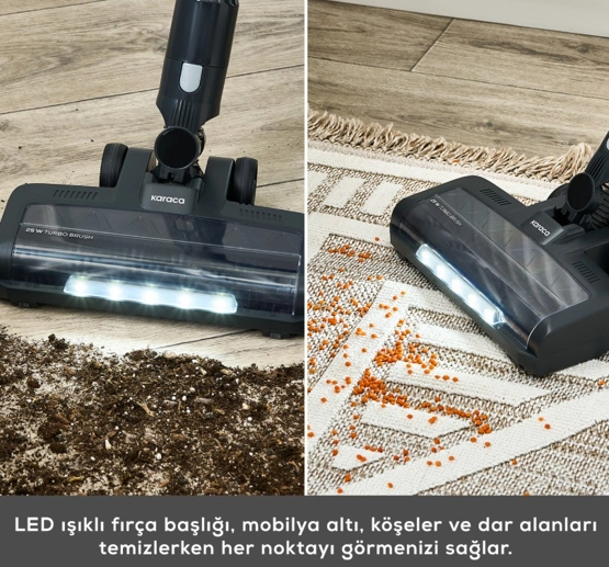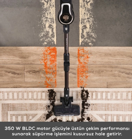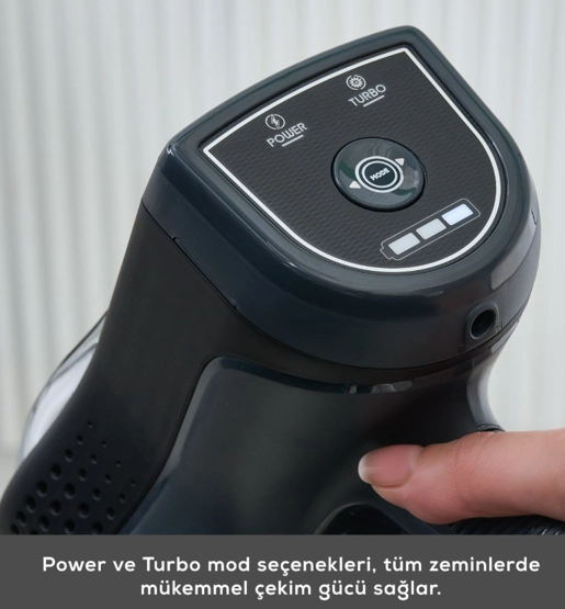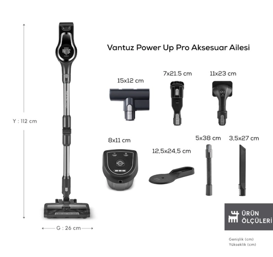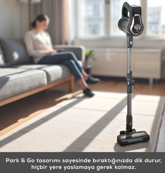 Karaca Vantuz Power Up Pro Dik Süpürge Black Chrome Power Force ailesi yenilendi. Artık Park Et & Git Özelliği ile çok daha kolay bir kullanım sunuyor. Park Et & Git Özelliği sayesinde; süpürürken istediğiniz zaman süpürgenizi dik konumda bırakabilirsiniz. Bu sayede temizlik yaparken bir şey almak için durmanız gerektiğinde ya da başka bir iş ile uğraşmanız gerektiğinde süpürgenizi güvenle ve hızlı bir şekilde park edebilirsiniz. Powermax Motor Vantuz Power Up Pro, geliştirilmiş Powermax motor teknolojisi sayesinde tüm zeminlerde yüksek çekim gücü ile kusursuz temizlik sağlar. Airmax Cyclone En güçlü torbasız süpürge teknolojisi Airmax Cyclone, hazne içerisindeki toz partiküllerinin ayrışmasını sağlar ve filtrelerin tıkanmasını önler. Böylece Vantuz Power Up Pro, çok daha uzun süre yüksek performansla çalışır. Üç Aşamalı Filtre 3 aşamalı HEPA, metal ve sünger katmanlı filtre sistemi sayesinde partiküllerin %99’unu hapsederek derinlemesine temizlik yapar. Led Işıklı Turbo Fırça 25 W motor gücünde LED ışıklı turbo fırçası, tüm zeminlerde en ufak tozları bile göstererek derinlemesine temizlik sağlar. Ouick&Click Toz Haznesi 0,6 litrelik kolay çıkarılıp takılabilen toz haznesi tek tuşla etrafa toz dağılmadan daha hijyenik bir şekilde boşaltılabilir. İki Farklı Güç Modu Power ve Turbo olarak iki farklı moda sahip Vantuz Power Up Pro, zemin ve kir tipine göre modlar arasında geçiş yaparak daha uzun çalışma süresi sunar. Farklı zeminlerde aktif temizlik sağlar. Tak-Çıkar Batarya Çıkarılabilir batarya teknolojisi sayesinde, Vantuz Power Up Pro süpürgeniz istenilen yerde veya askısında kolayca şarj edilebilir. Üstelik 2000 mAh batarya ile Power moduyla el tipi süpürge formunda 60 dakika, standart süpürge formundayken 50 dakika kesintisiz temizlik imkânı sunar. Ergonomik Tasarım Ergonomik tasarımı ve kolay manevra kabiliyeti sayesinde ulaşılması güç yerlere bile zorlanmadan ulaşır. Katlanabilir Boru Özelliği Katlanabilir borusu sayesinde yatak ve koltuk altı gibi ulaşılması güç yerlere bile zorlanmadan ulaşır. Kenar-Köşe Aparatı Kenar-köşe aparatı ile duvar diplerinde ve ulaşılması zor köşelerde biriken tozları rahatça temizleyebilirsiniz. 2 in 1 Toz Fırçası Vantuz Power Up Pro ‘nun 2 in 1 Fırçası ile koltuk, perde gibi yüzeylerin temizliğini kolayca yapabilirsiniz. Mini Turbo Fırça Koltuklarınızın üzerinde biriken tozları ve patili dostlarımızın tüylerini pratik bir şekilde temizleyebilirsiniz. Esnek Uzatma Hortumu 2’ si bir arada toz fırçası ve kenar köşe aparatıyla uyumlu esnek uzatma hortumu, evinizdeki veya aracınızdaki dar alanların temizliğini kolay hale getirir. Pet Aparatı Pet aparatı, evcil dostunuzun tüylerini kolayca taramak için özel olarak tasarlanmıştır. Tarama ve süpürmeyi aynı anda yapan pet aparatıyla evcil dostunuzun bakımını keyifli hale getirin.