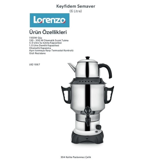 1100W Güç 150 - 300 W Otomatik Sıcak Tutma 5.0 Litre Su Isıtma Kapasites 1.0 Litre Demlik Kapasites Otomatik Kapanma Asırı Isınmaya Karsı Termostat Kontrolü 304 Kal te Paslanmaz Çelik Gizli Rezistans