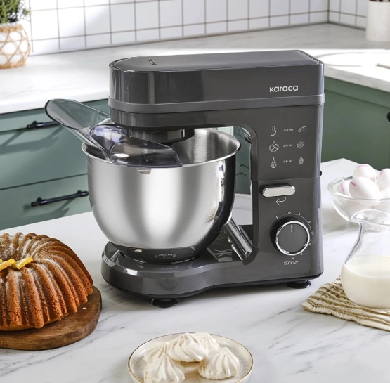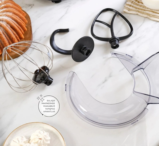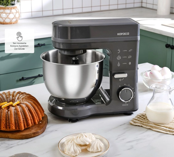 Özellikler 1500W motor gücü ile ideal çırpma, karıştırma ve yoğurma işlemlerini kolaylıkla gerçekleştirir. Yapışmaya karşı dirençli paslanmaz çelik kasesi ile kullanım esnasında müdahaleye gerek kalmadan homojen karışımlar elde edebilirsiniz. Tek hareketle açılabilen oynar başlıklı üst gövde ve güçlü tutucu ayaklar sayesinde hamur maksimum seviyede karışırken bile gövde stabil kalır. Özel tasarım çırpma teli kasenin her yerine ulaşarak hazne içinde gıda kalıntısı bırakmaz, en küçük porsiyonları bile rahatlıkla karıştırabilirsiniz. Aparatları bulaşık makinesinde yıkanabilir. Ek Özellikler 5 L lik geniş kaseye sahiptir. 6 kademeli hız ayarı ve ek pulse fonksiyonu vardır. 3 farklı aparatı ile tüm çırpma, yoğurma ve karıştırma işlemlerinizi rahatlıkla yapabilirsiniz. Hamur kancası ile ekmek, makarna, börek gibi tüm hamur işleriniz için istediğiniz miktar ve kıvamda hamuru yoğurarak mükemmel sonuçlar elde edebilirsiniz. Düz karıştırıcı aparatı ile püre, krep gibi karışımları en ideal kıvamda hazırlayabilirsiniz.
