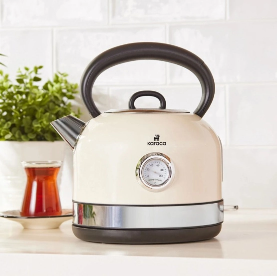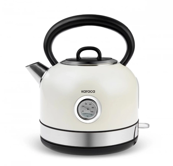 Karaca Retro Su Isıtıcısı 2202 2200W Retro tasarımı ile mutfağınıza şık bir hava katabilirsiniz. •Minimum seviyede ortalama 3 dakika, maksimum seviyede ortalama 5 dakikada suyunuzu kaynatır. •Sıcaklık göstergesi sayesinde suyun sıcaklığını takip edebilir, istediğiniz anda ısıtıcıyı kapatarak dilediğiniz sıcaklıkta su ısıtabilirsiniz. •Su seviyesi göstergesi ile ısıtacağınız su miktarını kolayca kontrol edebilir, enerji tasarrufu sağlayabilirsiniz. •Su kaynadığında otomatik kapanır. •360 derece döner tabanı ve kablosuz gövdesi kolay kullanmanızı ve kolay muhafaza etmenizi sağlar. •Kettle ağızlığında yer alan filtresi suyun sıçramasını önler. •Led ışıklı açma kapama düğmesine sahiptir. •Paslanmaz çelik gövde ve iç haznesi sağlıklı bir kullanım sunar. •1,7 lt su hacmi •2200 Watt