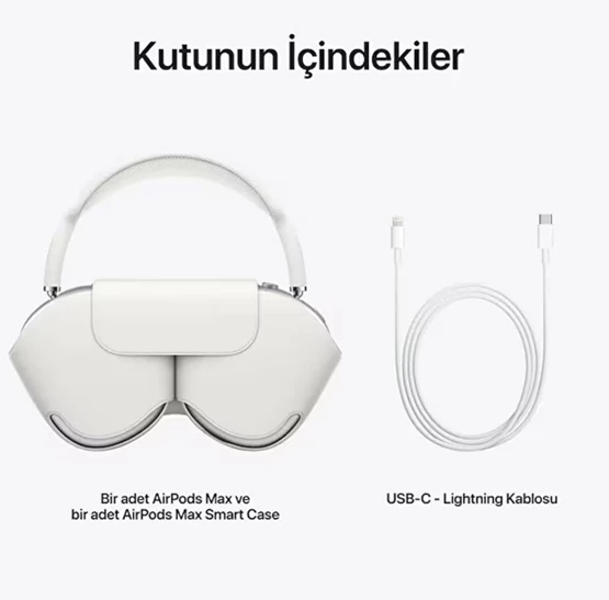 Genel Özellikler Kişiye özel benzersiz bir kulaklık deneyimi. Şimdi yepyeni renklerle. AirPods Max, büyüleyici detayda yüksek ses kalitesi sunuyor. Sizi çevreleyen bir ses deneyimi için, dinamik kafa izleme özellikli Kişiselleştirilmiş Uzamsal Ses. Dipnot ⁴ İstenmeyen sesleri engellemek için pro seviye Aktif Gürültü Engelleme. Dipnot ³ Şeffaf mod ise çevrenizi doğal bir biçimde duymanızı sağlıyor. Tek şarjla 20 saate kadar pil ömrü. Dipnot ¹³ Sihirli bir dinleme deneyimi için zahmetsiz kurulum ve kafa algılama özelliği. Ve şimdi kolay şarj için USB-C ile. Kutunun İçindekiler AirPods Max (USB-C) Smart Case USB-C Şarj Kablosu Belgeler