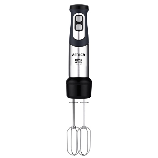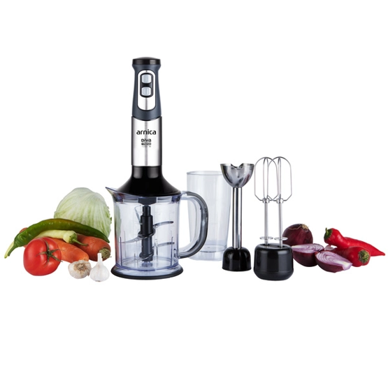 Diva Trend Blender Seti ergonomik tasarımı ve güvenli kullanımıyla mutfağınızın en iyi yardımcısı olacak. Yenilenen güçlü 1200 W performansı ile paslanmaz çelik bıçakları en zor görünen sebze ve meyvelerin bile kolaylıkla kesilmesini sağlıyor. El Blender Seti çift bıçaklı doğrayıcı kabı ve paslanmaz çelik çırpma telleri kısa sürede lezzetli yemekler yapmanıza olanak tanıyor. 1.2 lt kapasiteli parçalama haznesine sahip olan el blender seti, 600 ml ölçü kabı ile de öne çıkıyor. Kolay kavrama, güvenli kullanım sağlayan tutma sapı ve kolay tuş sistemi güvenli bir kullanım imkanı da sağlıyor. Çift kademeli hız sistemi ile üretilen blender, turbo fonksiyonu da devreye girdiğinde pratik bir hazırlama süreci sunuyor.El blender seti, kolay çevirmeli aksesuar çıkartma sistemine sahip olduğundan kullanımı oldukça kolaylaştırıyor. Kullanışlı olmasının yanı sıra ekstra dayanıklı doğrayıcı haznesi uzun kullanım ömrü sağlıyor.Bulaşık makinesinde yıkanabilir aksesuarlara sahip olan blender seti ile ayrı bir efor sarf etmeye gerek kalmıyor. 3 yıl garantili olan en kaliteli ve uygun Arnica blender fiyatlarına Arnica güvencesi ile ulaşabilir, hemen satın alabilirsiniz.