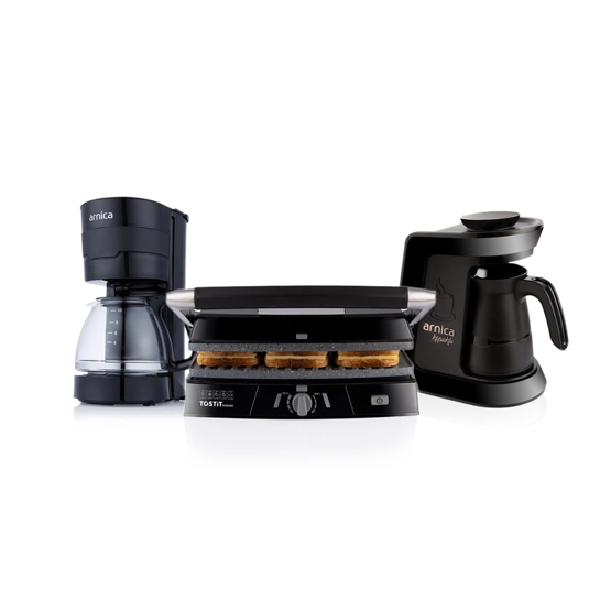 Arnica Siyah Çeyiz Seti; Çeyiz Paketi İçeriği : -Arnica IH32130 Filtre Kahve Makinesi Renk: Siyah, Arnica GH32059 Köpüklü Türk Kahve Makinesi Renk: Siyah Siyah, Arnica GH26300 Tostit Tost Makinesi Renk Siyah