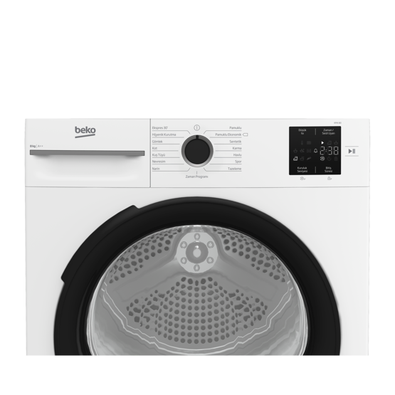 YENİ ÜRÜN *****10 YIL MOTOR GARANTİSİ***** Ölçüler Ağırlık 39.5 kg Yükseklik 84.6 cm Genişlik 59.8 cm Derinlik 54.5 cm Konfor ve Güvenlik Dokunmatik Tuş Var Tank Pozisyonu Üst Kırışık Önleme Var Program Takip Göstergesi Var Kalan Zaman Göstergesi Var Zaman Erteleme Özelliği 0-24 Saat Tambur Aydınlatma DC LED Direkt Su Tahliyesi Var Su Tankı Dolu Uyarısı Var Kondenser Temizleme Uyarısı Var Fıltre Temizleme Uyarısı Var Program Sonu Sesli Uyarı Var Çocuk Kilidi Var Pratik Filtre Var Teknolojik Özellikler Kurutma Teknolojisi Isı Pompalı Kurutma Kontrol Tipi Eco Sense Tambur Deseni Aquawave Genel Özellikler Maksimum Kurutma Kapasitesi 8 kg Enerji Sınıfı A++ Program Sayısı 15 Programlı Tambur Hacmi (L) 92.5 Ürün Rengi Beyaz Yıllık Enerji Tüketimi (kWh) 236 kWh Ses Gücü Seviyesi (dBA) 64 dBA Programlar Program-1 Pamuklular Program-2 Pamuklu Ekonomik Kurutma Program-3 Sentetik Program-4 Karma Program-5 Havlu Program-6 Açık Hava/Spor (Goretex) Program-7 Tazeleme Program-8 Zaman Programları Program-9 Narin Program-10 Yorgan Program-12 Kot Program-13 Gömlek Program-14 Hijyenik Kurutma Program-15 Ekspres 30'