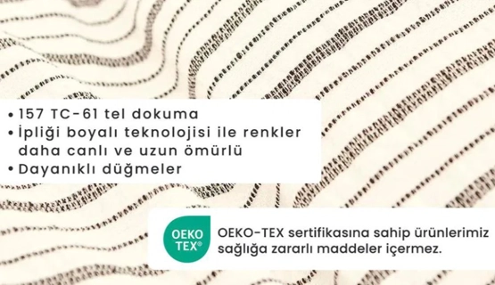 %100 Pamuk özel yumuşak tuşeli yıkamalı, çift iğne 30 Derecede yıkanabilir, Düşük devirde sıkma yapılabilir, Tamburlu makinada düşük ısıda kurutma yapılabilir , Düşük ısı ayarında ütülenebilir, Benzer renkler ile yıkayınız, Ağartıcı kullanılmaz. Ürün %100 Türk malı olup. OEKO-TEX ve BSCI sertifikalıdır. 61 Tel Pamuklu Nevresim. Kanserojen ve alerjen metaller içermez. Cildi tahriş etmez ve insan sağlığına zarar vermez. Sağlığımız için risk teşkil eden azoik boya kullanılmaz. Paket İçeriği: 1 Adet 200x220 nevresim 2 Adet 50x70 yastık kılıfı 1 Adet 240x260 çarşaf