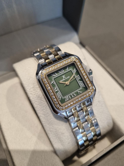 Kasa Çapı: 29 mm - Kasa Şekli: Kare - Kasa Materyali: Metal - Kasa Rengi: Gümüş - Kordon Materyali: Çelik - Kordon Rengi: Gümüş/Altın Rengi- Kadran Rengi: Yeşil - Kadran Işığı: Yok - Taş: Var - Çalışma Şekli: Analog - Teknolojisi: Quartz - Takvim: Yok - Kronometre: Yok - Alarm: Yok - Cam Özelliği: Mineral - Özellik: Kordon Genişliği: 16 mm - Kasa Yüksekliği: 37 mm - Su Geçirmezlik: 3 ATM - Garanti Süresi: 2 YIL - Cinsiyet: Kadın