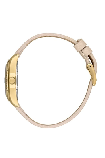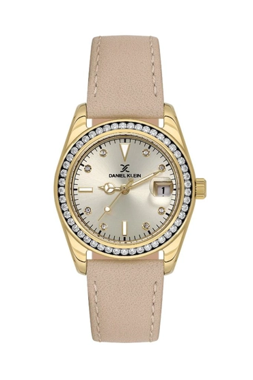 Daniel Klein DK.1.13714-3 Deri Kordon Taşlı Tasarım Bombeli Takvim Krem Rengi Kadın Kol Saati