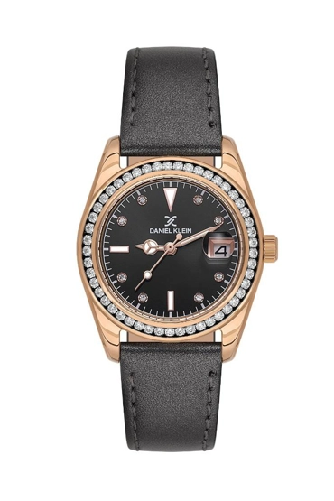 Daniel Klein DK.1.13714-4 Deri Kordon Taşlı Tasarım Bombeli Takvim Gri Renk Kadın Kol Saati