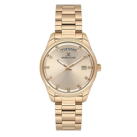 Daniel Klein DK.1.13718-2 Gün ve Tarih Göstergeli Suya Dayanıklı Taşlı Tasarım Altın Renk Kadın Kol Saati