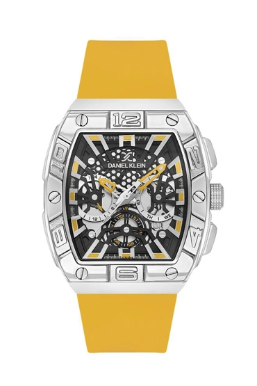 Daniel Klein DK.1.13757-2 Exclusive Dikdörtgen Kasa Tüm Fonksiyonları Aktif 5 ATM Suya Dayanıklı Silikon Kordonlu Sarı Erkek Kol Saati Çok Renkli