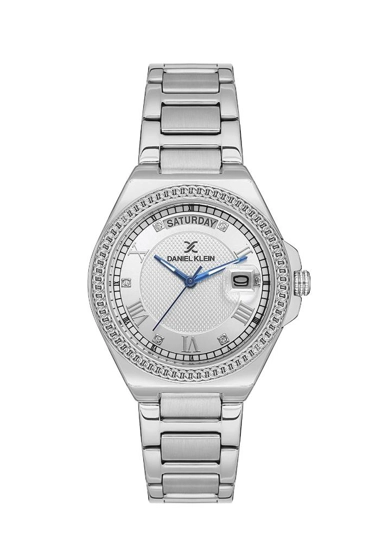 Daniel Klein DKE.1.10786-1 Bombeli Takvim Gün Göstergeli Romen Rakamlı Taşlı Tasarım Metalik Renk Kadın Kol Saati