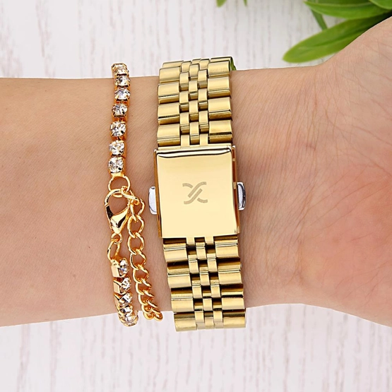 Kasa Çapı: 27 mm - Kasa Şekli: Dikdörtgen - Kasa Materyali: Metal - Kasa Rengi: Altın Rengi - Kordon Materyali: Çelik - Kordon Rengi: Altın Rengi- Kadran Rengi: Gümüş Tonu - Kadran Işığı: Yok - Taş: Var - Çalışma Şekli: Analog - Teknolojisi: Quartz - Takvim: Yok - Kronometre: Yok - Alarm: Yok - Cam Özelliği: Mineral - Özellik: Bileklik Hediyeli - Su Geçirmezlik: 3 ATM - Garanti Süresi: 2 YIL - Cinsiyet: Kadın