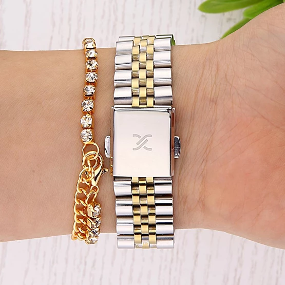 Kasa Çapı: 27 mm - Kasa Şekli: Dikdörtgen - Kasa Materyali: Metal - Kasa Rengi: Altın Rengi - Kordon Materyali: Çelik - Kordon Rengi: Metalik Gri/Altın Rengi- Kadran Rengi: Gümüş Tonu - Kadran Işığı: Yok - Taş: Var - Çalışma Şekli: Analog - Teknolojisi: Quartz - Takvim: Yok - Kronometre: Yok - Alarm: Yok - Cam Özelliği: Mineral - Özellik: Bileklik Hediyeli - Su Geçirmezlik: 3 ATM - Garanti Süresi: 2 YIL - Cinsiyet: Kadın