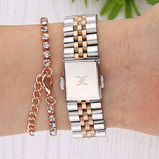 Kasa Çapı: 27 mm - Kasa Şekli: Dikdörtgen - Kasa Materyali: Metal - Kasa Rengi: Rose Gold - Kordon Materyali: Çelik - Kordon Rengi: Metalik Gri/Rose Gold- Kadran Rengi: Gümüş Tonu - Kadran Işığı: Yok - Taş: Var - Çalışma Şekli: Analog - Teknolojisi: Quartz - Takvim: Yok - Kronometre: Yok - Alarm: Yok - Cam Özelliği: Mineral - Özellik: Bileklik Hediyeli - Su Geçirmezlik: 3 ATM - Garanti Süresi: 2 YIL - Cinsiyet: Kadın