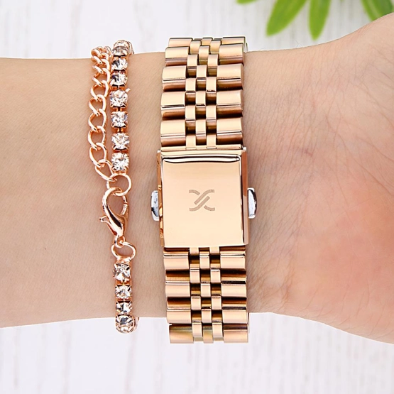 Kasa Çapı: 27 mm - Kasa Şekli: Dikdörtgen - Kasa Materyali: Metal - Kasa Rengi: Rose Gold - Kordon Materyali: Çelik - Kordon Rengi: Rose Gold- Kadran Rengi: Rose Gold - Kadran Işığı: Yok - Taş: Var - Çalışma Şekli: Analog - Teknolojisi: Quartz - Takvim: Yok - Kronometre: Yok - Alarm: Yok - Cam Özelliği: Mineral - Özellik: Bileklik Hediyeli - Su Geçirmezlik: 3 ATM - Garanti Süresi: 2 YIL - Cinsiyet: Kadın
