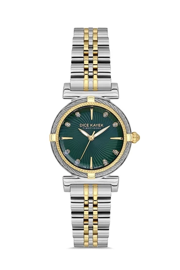Dice Kayek DK.1.AG1401.03 Taşlı Tasarım Çelik Kordon Çelik Kasa 5 ATM Suya Dayanıklı Metalik-Altın Renk Kadın Kol Saati