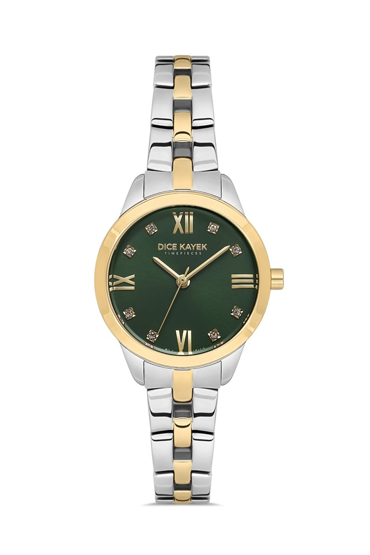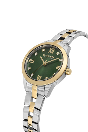Dice Kayek DK.1.AG1410.06 Taşlı Tasarım Çelik Kordon Çelik Kasa 5 ATM Suya Dayanıklı Metalik-Altın Renk Kadın Kol Saati Çok Renkli