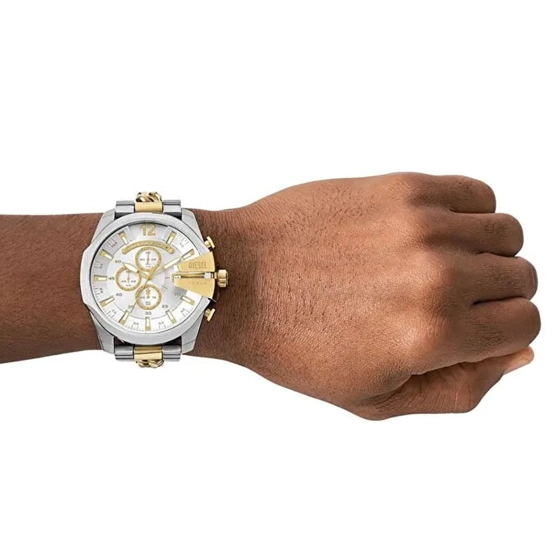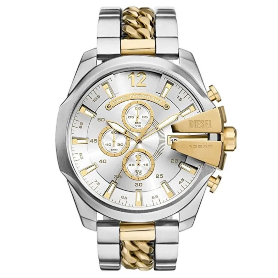 Kasa Çapı: 51 mm - Kasa Şekli: Yuvarlak - Kasa Materyali: Çelik - Kasa Rengi: Metalik Gri - Kordon Materyali: Çelik - Kordon Rengi: Altın Rengi/Metalik Gri- Kadran Rengi: Gümüş - Kadran Işığı: Yok - Taş: Yok - Çalışma Şekli: Analog - Teknolojisi: Quartz - Takvim: Var - Kronometre: Var - Alarm: Yok - Cam Özelliği: Mineral - Özellik: Kordon Genişliği: 26 mm - Kordon Uzunluğu: 20 cm - Su Geçirmezlik: 10 ATM - Garanti Süresi: 2 YIL - Cinsiyet: Erkek