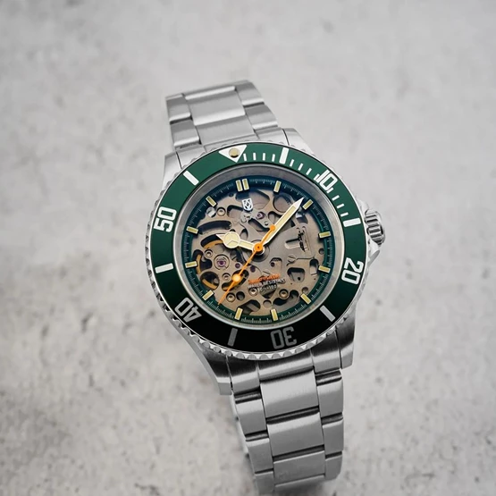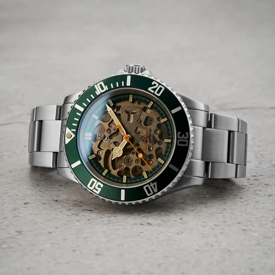 Kasa Çapı: 40 mm - Kasa Şekli: Yuvarlak - Kasa Materyali: Çelik - Kasa Rengi: Metalik Gri - Kordon Materyali: Çelik - Kordon Rengi: Metalik Gri- Kadran Rengi: Yeşil - Kadran Işığı: Yok - Taş: Yok - Çalışma Şekli: Analog - Teknolojisi: Otomatik - Takvim: Yok - Kronometre: Yok - Alarm: Yok - Cam Özelliği: Safir - Özellik: Kasa Kalınlığı: 13 mm - LUG TO LUG: 46,5 mm - Kordon Genişliği: 20 mm - Ağırlık: 200 Gr - Su Geçirmezlik: 10 ATM - Garanti Süresi: 2 YIL - Cinsiyet: Erkek