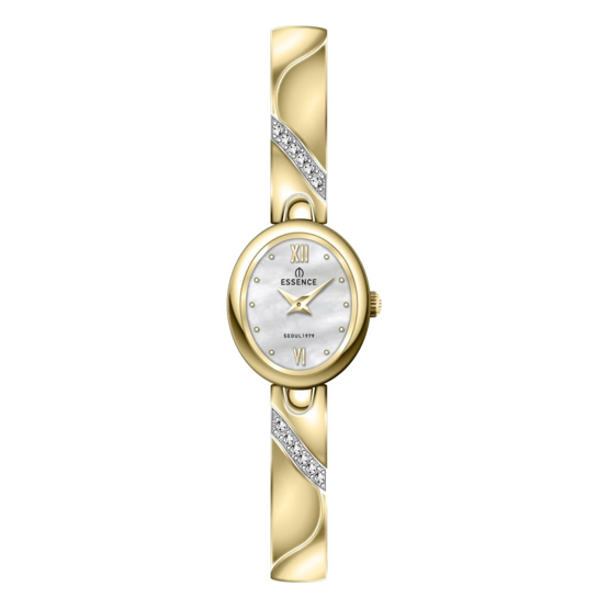 Essence D1240.120 Minimal Taşlı Tasarım Sedefli Oval Kadran Metal Kordon Metal Kasa 3 ATM Suya Dayanıklı Altın Renk Kadın Kol Saati