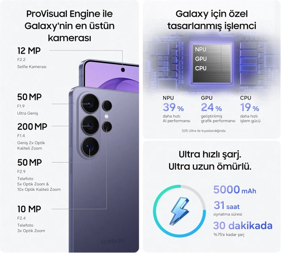 Armor Aluminum çerçeve ve Corning Gorilla Glass ile güçlendirilerek suya dayanıklı olacak şekilde geliştirilmiştir Galaxy S26 Ultra, gelişmiş yapay zeka performansı için optimize edilmiş NPU, GPU ve CPU birimleriyle güçlendirilen, özelleştirilmiş işlemci Snapdragon 8 Elite Gen 5'e sahiptir Bütün ekranı, yalnızca bildirimleri veya uygulamaları gizleyebilirsiniz Vapor Chamber yeni tasarımı sayesinde ısıyı daha hızlı dağıtır ve yüzde 21 daha yüksek termal performans sağlar Süper Hızlı Şarj 3.0, pil sağlığını etkilemeden cihazınızı ultra yüksek hızla şarj eder