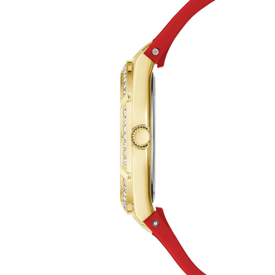 Kasa Çapı: 36 mm - Kasa Şekli: Yuvarlak - Kasa Materyali: Çelik - Kasa Rengi: Altın - Kordon Materyali: Silikon - Kordon Rengi: Kırmızı- Kadran Rengi: Altın - Kadran Işığı: Yok - Taş: Var - Çalışma Şekli: Analog - Teknolojisi: Quartz - Takvim: Yok - Kronometre: Yok - Alarm: Yok - Cam Özelliği: Mineral - Özellik: Ağırlık: 53 gr - Kordon Uzunluğu: 19 cm - Su Geçirmezlik: 3 ATM - Garanti Süresi: 2 YIL - Cinsiyet: Kadın