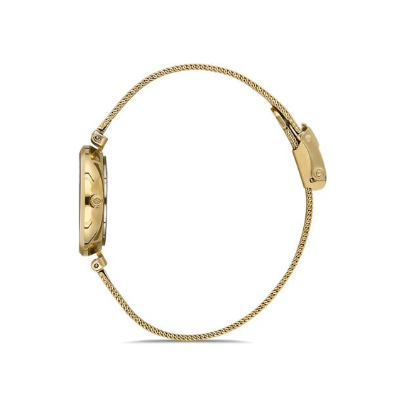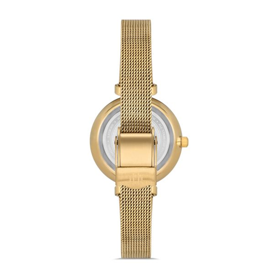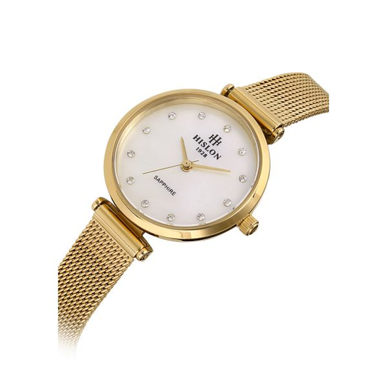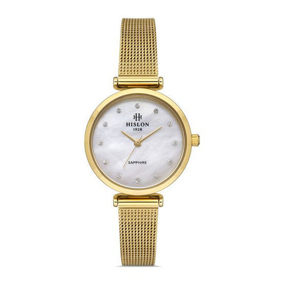 Hislon QL125G-09SG Safir Camlı Taşlı Tasarım Sedef Kadran Hasır Kordon Çelik Kasa 3 ATM Suya Dayanıklı Altın Renk Kadın Kol Saati