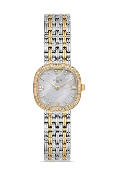 Hislon QL190T-09SG Taşlı Tasarım Sedefli Kare Kadranlı Çelik Kordon Çelik Kasa 3 ATM Suya Dayanıklı Metalik-Altın Renk Kadın Kol Saati Çok Renkli