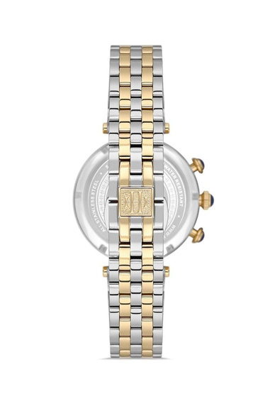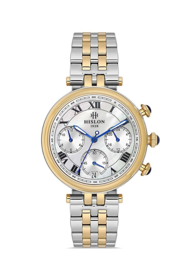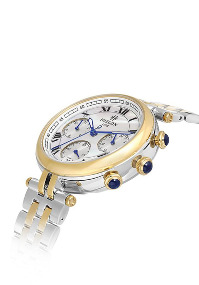 Hislon QT144T-09SG Tüm Fonksiyonları Aktif Safir Camlı Çelik Kordon Çelik Kasa 5 ATM Suya Dayanıklı Metalik-Altın Renk Kadın Kol Saati Çok Renkli