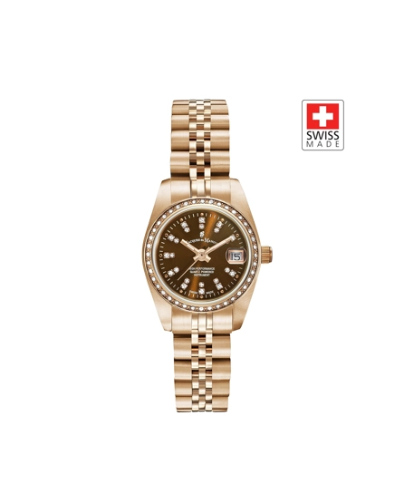 Kasa Çapı: 26 mm - Kasa Şekli: Yuvarlak - Kasa Materyali: Çelik - Kasa Rengi: Rose Gold - Kordon Materyali: Çelik - Kordon Rengi: Rose Gold- Kadran Rengi: Kahverengi - Kadran Işığı: Yok - Taş: Var - Çalışma Şekli: Analog - Teknolojisi: Quartz - Takvim: Var - Kronometre: Yok - Alarm: Yok - Cam Özelliği: Mineral - Özellik: Swiss Made - Su Geçirmezlik: 5 Atm - Garanti Süresi: 2 yıl - Cinsiyet: Kadın