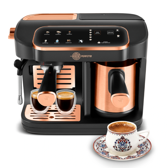 Karaca Hatır Perfetto Espresso ve Türk Kahvesi Makinesi Karaca Hatır Perfetto Espresso ve Türk Kahvesi Makinesi, kahve deneyimini yeniden tanımlayan özel bir tasarım olarak geliştirildi. Dünyada ilk kez Türk kahvesi ve espresso’nun aynı gövdede bir araya getirildiği bu model, közde Türk kahvesi lezzetini 20 bar basınca sahip profesyonel espresso sistemiyle tek cihazda buluşturdu. Geniş fonksiyon yapısı sayesinde, kalabalık ortamlarda dahi beklemeden kahve servisi gerçekleştirme olanağı sundu. Dünyada İlk Kez Türk Kahvesi ve Espresso Tek Makinede Hatır Perfetto, hem geleneksel Türk kahvesi geleneğini hem de modern espresso kültürünü aynı cihazda bir araya getiren ilk teknoloji olarak geliştirildi. Türk kahvesi modunda közde pişirme hissi veren yoğun aromalı ve bol köpüklü kahveler üretirken; espresso tarafında profesyonel barista standartlarına uygun yoğun gövdeli espresso sonuçları elde edildi. Aynı anda iki farklı kahve türünü hazırlamaya olanak tanıyan cihaz, 22’nin üzerinde içecek alternatifini destekleyen kapsamlı bir kahve repertuarı ile kullanıcıların farklı damak tercihlerine uyum sağladı. Hatır Perfetto’nun Geliştirilen Teknolojileri AquaBrew Tech ile Otomatik Su Alma ve Homojen Türk Kahvesi Hazırlığı AquaBrew teknolojisi, suyun cezve içine ideal şekilde püskürtülmesini sağlayan özel bir sistem olarak tasarlandı. Bu teknoloji, kahvenin homojen biçimde karışmasına imkân tanıyarak yoğun aroma ve krema yoğunluğuna sahip Türk kahvesi sonuçları ortaya koydu. Otomatik su alma özelliği ise hazırlama sürecinde hata payını ortadan kaldıracak şekilde yapılandırıldı. Akıllı Isı Ayarı ile Her Kullanımda Aynı Kıvam Akıllı Isı Ayar Teknolojisi, ortam şartlarına göre ideal ısı dengesini oluşturarak Türk kahvesinin her hazırlamada aynı kıvam, aynı köpük yoğunluğu ve aynı lezzet seviyesinde elde edilmesini sağlayan gelişmiş bir kontrol sistemi olarak geliştirildi. 20 Bar Basınç Gücü ile Profesyonel Espresso 20 bar basınç pompası, espresso taneciklerinden maksimum aroma çıkışı elde etmek üzere optimize edildi. Böylece espresso shot’larında yoğun gövde, belirgin krema tabakası ve barista standardında ekstraksiyon sonucu elde edildi. 1900W Güç ve Thermoblock Isıtma Sistemi 1900 Watt güç, cihazın kısa sürede kullanım için hazır hâle gelmesini sağlayan yüksek performanslı bir ısıtma altyapısı oluşturdu. Thermoblock ısıtma sistemi ise suyun ve buharın hızlı ve stabil şekilde ısınmasını sağlayarak özellikle sütlü kahve hazırlıklarında ideal çalışma temposu yarattı. 1,8 Litre Geniş Su Haznesi 1,8 litrelik su haznesi, yoğun tüketim dönemlerinde dahi uzun süre su ekleme ihtiyacını azaltan güçlü bir kapasite sundu. Böylece gün içinde ardışık espresso, sütlü kahve ve Türk kahvesi hazırlıkları sorunsuz biçimde sürdürüldü. Aynı Anda İki Fincan Espresso Hazırlığı Tek ve çift doz fonksiyonlarıyla espresso hazırlığı esnasında iki fincana kadar eş zamanlı kahve elde edilmesine olanak tanındı. Böylece espresso servisi gerektiren anlarda zaman kazanımı sağlandı. İkili Filtre Seti ile Doğru Dozaj Cihaz, tek doz ve çift doz için iki farklı filtreyle donatıldı. Bu filtreler, doğru miktarda kahve kullanımını destekleyerek her içimde stabil aroma ve akış dengesinin elde edilmesini amaçlar. Sütlü Tarifler İçin Geliştirilen Fonksiyonlar Süt Köpürtme ve Isıtma Yapısı Yan bölümde konumlandırılan süt köpürtücü, cappuccino ve latte hazırlığında ihtiyaç duyulan köpük yoğunluğunu elde etmek için tasarlandı. Çevrilebilir buhar düğmesi, sütün dokusunu kullanıcının tercihine göre ısıtma veya köpürtme imkânı sunan kontrollü bir yapı oluşturdu. Sıcak Su Fonksiyonu Sıcak su fonksiyonu, espressoyu americano’ya dönüştürme, çay veya diğer sıcak içecekleri hazırlama ihtiyacını karşılayacak şekilde sisteme entegre edildi. Profesyonel Aksesuar Seti ve Ergonomik Yapı Ergonomik Barista Kolu Ergonomik barista kolu, porta filtrenin kontrollü sıkıştırma ve kolay takıp çıkarma işlemleri için geliştirilmiş konforlu bir tutuş sağladı. 2 Çıkışlı 51 mm Alüminyum Porta Filtre 51 mm alüminyum porta filtre, espresso akışının iki fincana dengeli biçimde dağılmasına imkân tanıyan hassas bir çıkış yapısıyla üretildi. 22+ farklı kahve seçeneği; Közde Türk Kahvesi (Tek Seferde 5 Fincan), Espresso, Double Espresso, Americano, Ice Espresso, Sıcak Su, Doppio, Long Black, Espresso Lungo, Macchiato, Caramel Macchiato, Cappuccino, Cortado, Flat White, Latte, Piccolo Latte, Mocha, Süt Köpüğü, Sıcak Süt, Caffe Crema, Ristretto, Ice Latte, Ice Cappuccino, Ice Mocha, Ice Americano, Affogato Kutu İçeriği: Barista Seti Su Haznesi Kapağı Su Haznesi Makine Gövdesi Fincan Saklama Plakası Süt Köpürtme / Sıcak Su Kolu Süt Köpürtme Çubuğu Tamper Damlama Tepsisi Kapağı Damlama Tepsisi Porta Filtre Türk Kahvesi Cezvesi Ölçü Kaşığı Süt Potu (Pitcher) Cezve Temizleme Fırçası Ölçü kaşığı, kahvenin doğru miktarda ve topaklanma olmadan alınmasını sağlayacak özel bir formda tasarlandı. Temizleme fırçası ise cezve ve porta filtrede oluşan kalıntıların kolay biçimde temizlenmesi için kutu içeriğine dahil edildi. Güvenlik Yapıları ve Kolay Temizlik 3 Aşamalı Koruma Sistemi Basınç Koruması: Fazla basıncın önlenmesi amacıyla güvenli çalışma sınırları oluşturuldu. Otomatik Kapanma: Kullanım sonrasında cihazın kendini otomatik kapatması için zamanlayıcı sistem geliştirildi. Aşırı Isınma Koruması: Riskli sıcaklık seviyelerinde cihazın işlemi durdurarak koruma sağlaması amaçlandı. Çıkarılabilir Damlama Tepsisi Damlama tepsisi, döküntü ve taşmaların kontrollü biçimde toplanması için geniş hacimli çıkar