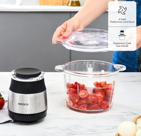Karaca Megablend 3L Ultra Geniş Cam Hazneli Doğrayıcı 1,5 Kg Domatesi Tek Seferde Doğramak Çok Kolay! 500W motor gücü, 3 litrelik geniş hacmi ve yenilikçi tasarımıyla mutfakta pratik çözümler sunar. 4 paslanmaz çelik bıçağıyla et,sebze ve kuruyemiş gibi sert gıdaları mükemmel bir şekilde doğrayabilir. Bulaşık makinesinde yıkanabilir haznesi temizliği pratikleştirir. TEKNİK ÖZELLİKLER 500 Watt Motor Gücü Inox Gövde 3L Geniş Cam Hazne 4 Adet Paslanmaz Çelik Bıçak 1,5 kg Domates Doğrama Paslanmaz Çelik Inox Gövde Turbo Özelliği Kolay Temizlik Güvenli Kullanım ÖLÇÜ Boy: 22,7 cm En: 22,7 cm Yükseklik: 26,3 cm Ağırlık: 2,67 kg