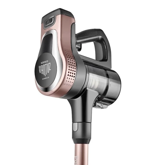 Karaca Vantuz Power Up Dikey Süpürge Rosegold Power Force ailesi yenilendi. Artık Park Et & Git Özelliği ile çok daha kolay bir kullanım sunuyor. Park Et & Git Özelliği sayesinde; süpürürken istediğiniz zaman süpürgenizi dik konumda bırakabilirsiniz. Bu sayede temizlik yaparken bir şey almak için durmanız gerektiğinde ya da başka bir iş ile uğraşmanız gerektiğinde süpürgenizi güvenle ve hızlı bir şekilde park edebilirsiniz. Powermax Motor: Vantuz Power Up, geliştirilmiş Powermax motor teknolojisi sayesinde tüm zeminlerde yüksek çekim gücü ile kusursuz temizlik sağlar. Airmax Cyclone: En güçlü torbasız süpürge teknolojisi Airmax Cyclone, hazne içerisindeki toz partiküllerinin ayrışmasını sağlar ve filtrelerin tıkanmasını önler. Böylece Vantuz Power Up, çok daha uzun süre yüksek performansla çalışır. Üç Aşamalı Filtre: 3 aşamalı HEPA, metal ve sünger katmanlı filtre sistemi sayesinde partiküllerin %99’unu hapsederek derinlemesine temizlik yapar. Led Işıklı Turbo Fırça: 15 W motor gücünde LED ışıklı turbo fırçası, tüm zeminlerde en ufak tozları bile göstererek derinlemesine temizlik sağlar. Quick & Click Toz Haznesi: 0,6 litrelik kolay çıkarılıp takılabilen toz haznesi tek tuşla etrafa toz dağılmadan daha hijyenik bir şekilde boşaltılabilir. Üç Farklı Güç Modu: Eco, Power ve Turbo olarak üç farklı moda sahip Vantuz Power Up, zemin ve kir tipine göre modlar arasında geçiş yaparak daha uzun çalışma süresi sunar. Farklı zeminlerde aktif temizlik sağlar. Tak-Çıkar Batarya: Çıkarılabilir batarya teknolojisi sayesinde, Vantuz Power Force süpürgeniz istenilen yerde veya askısında kolayca şarj edilebilir. Üstelik 2000 mAh batarya ile 45 dk kesintisiz temizlik imkânı sunar. Ergonomik Tasarım: Ergonomik tasarımı ve kolay manevra kabiliyeti sayesinde ulaşılması güç yerlere bile zorlanmadan ulaşır. Aparatlar: Kenar-Köşe Aparatı Kenar-köşe aparatı ile duvar diplerinde ve ulaşılması zor köşelerde biriken tozları rahatça temizleyebilirsiniz. 2 in 1 Toz Fırçası Vantuz Power Up 'ın 2 in1 Fırçası ile koltuk, perde gibi yüzeylerin temizliğini kolayca yapabilirsiniz.