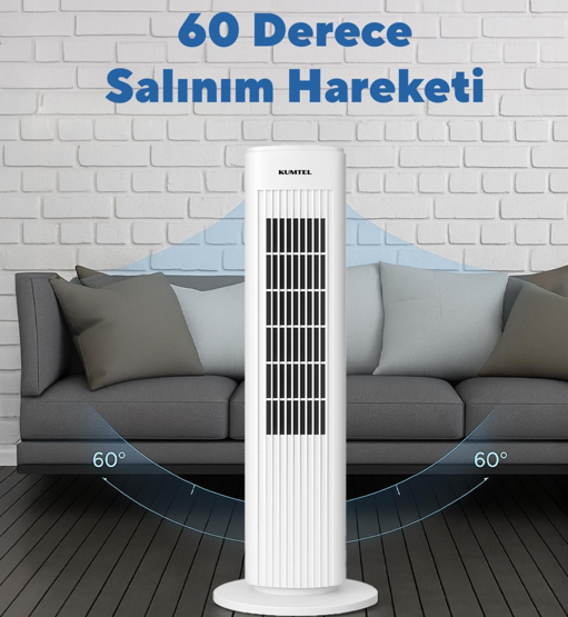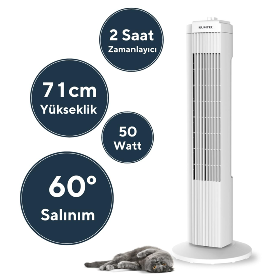 Kumtel KTF-258W Kule Vantilatör Beyaz 50 Watt yüksek performans 3 Hız seçeneği 60° Salınım 71 CM Maksimum yükseklik 2 Saatlik zamanlayıcı Yüksek kaliteli motor 24 Ay Kumtel Garantili.