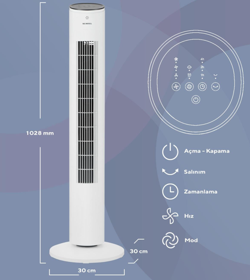 Kumtel KTF-360 Kule Tipi Vantilatör Beyaz 50W güce sahip bu kule tipi vantilatör, güçlü ve dengeli hava akışı sunarak yaşam alanlarında etkili serinlik sağlar. 3 kademeli hız ayarı ve Bebek, Uyku ve Normal olmak üzere 3 farklı rüzgar modu, kullanım ihtiyacına göre ideal hava akışını oluşturur. 60° ±5° salınım fonksiyonu, havanın ortama eşit şekilde dağılmasını sağlarken, 7 saat programlanabilir zamanlayıcı ve çok fonksiyonlu uzaktan kumanda kullanım konforunu artırır. Elektrik kesintilerinde hafıza özelliği ayarların korunmasını sağlarken, otomatik kapanma fonksiyonu güvenli kullanım sunar. Dayanıklı AC bakır motoru, uzun ömürlü ve güçlü performans sağlarken ürün 24 ay garanti güvencesiyle sunulmaktadır. Öne Çıkan Özellikler 50W güç, 220–240V ~ 50 Hz 3 kademeli hız ayarı 3 rüzgar modu: Bebek, Uyku, Normal 60° ±5° salınım fonksiyonu 7 saat programlanabilir zamanlayıcı Çok fonksiyonlu uzaktan kumanda Elektrik kesildiğinde hafıza özelliği Otomatik kapanma fonksiyonu Yüksek kaliteli AC bakır motor Ürün ölçüleri: 300 × 300 × 1028 mm Net ağırlık: 3.5 kg 24 Ay Kumtel Garantili