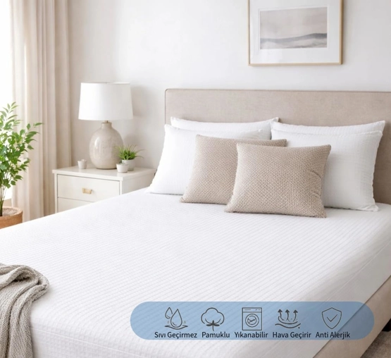 SIVI GEÇIRMEZ KORUMA: Sıvı geçirmez özelliği sayesinde yatağınızı sıvılara karşı tam koruma sağlar, aynı zamanda hava geçirgenliği ile konforlu bir uyku sunar PAMUKLU KUMAŞ: Yumuşak pamuklu malzemeden üretilmiş olup cildinize nazik dokunuş sağlar ve rahat bir uyku deneyimi sunar KOLAY KULLANIM: Lastikli tasarımı sayesinde yatağınıza kolayca takılır ve çıkarılır, kayma yapmadan sağlam bir şekilde yerinde durur ANTİ ALERJİK ÖZELLİK: Anti alerjik yapısı ile hassas ciltler için uygundur ve sağlıklı bir uyku ortamı oluşturur MAKINEDE YIKANABİLİR: Pratik bakım için makinede yıkanabilir özelliğe sahiptir, uzun ömürlü kullanım için dayanıklı yapıya sahiptir. Yumoş Pamuklu Lastikli Sıvı Geçirmez Alez Septumium Yumoş Pamuklu Fitted Alez, yatak koruma çözümlerinde konfor ve işlevselliği bir araya getiren akıllı bir üründür. Sıvı geçirmez özelliği sayesinde yatağınızı sıvı dökülmelerine ve lekelere karşı etkili bir şekilde korurken, hava geçirgen yapısı sayesinde rahat bir uyku deneyimi sunar. Pamuklu kumaşı ciltle dost olup, terlemeyi önleyerek ferah bir uyku ortamı yaratır. Lastikli tasarımı sayesinde yatağınıza kolayca takılır ve kullanım sırasında kayma yapmaz, her zaman yerinde kalır. Anti alerjik özelliği ile hassas ciltlere sahip kullanıcılar için de idealdir. Beyaz rengi, her yatak odasına uyum sağlayarak şık ve temiz bir görünüm kazandırır. Yıkanabilir yapısı ile uzun ömürlü kullanım sunan bu alez, hem pratik hem de hijyenik bir çözümdür. Yatağınızın ömrünü uzatmak ve her gece konforlu bir uyku için Septumium Yumoş Pamuklu Fitted Alez'i tercih edin.
