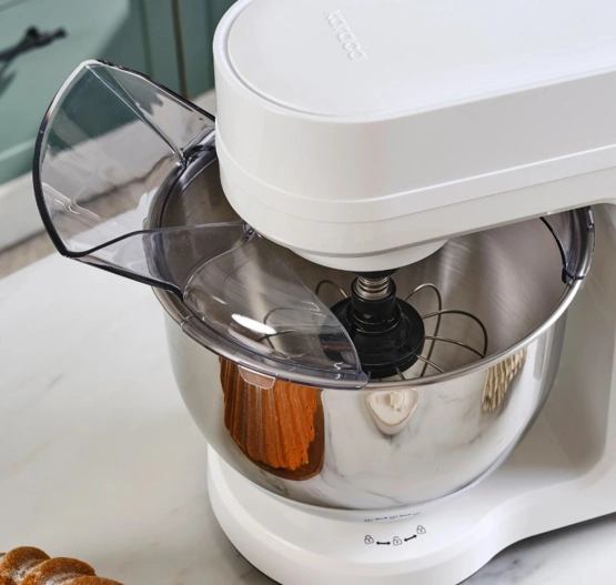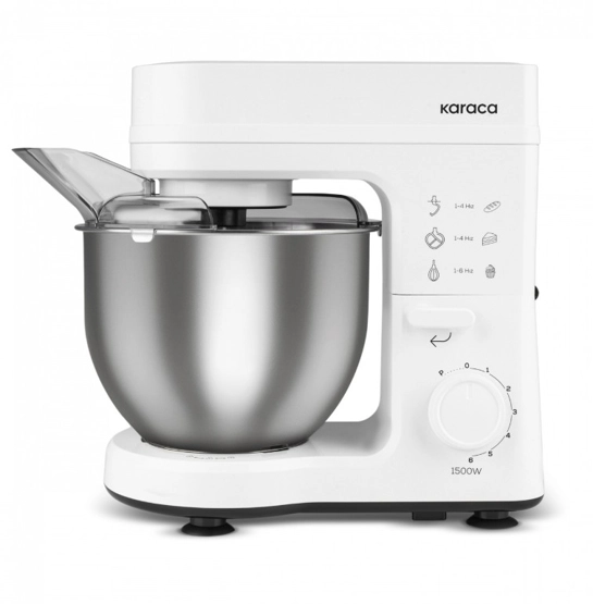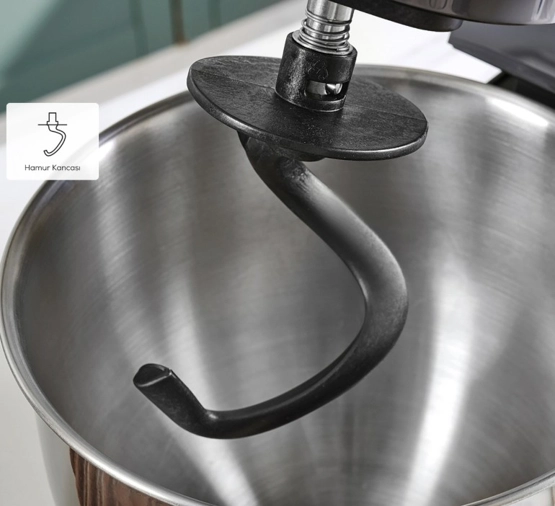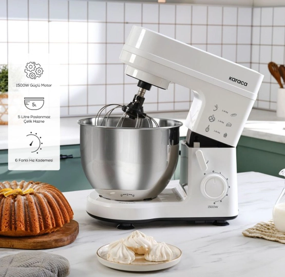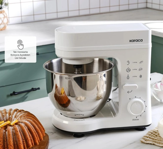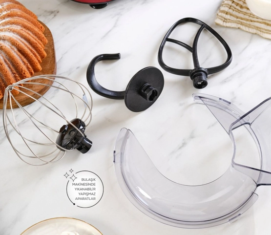 Özellikler 1500W motor gücü ile ideal çırpma, karıştırma ve yoğurma işlemlerini kolaylıkla gerçekleştirir. Yapışmaya karşı dirençli paslanmaz çelik kasesi ile kullanım esnasında müdahaleye gerek kalmadan homojen karışımlar elde edebilirsiniz. Tek hareketle açılabilen oynar başlıklı üst gövde ve güçlü tutucu ayaklar sayesinde hamur maksimum seviyede karışırken bile gövde stabil kalır. Özel tasarım çırpma teli kasenin her yerine ulaşarak hazne içinde gıda kalıntısı bırakmaz, en küçük porsiyonları bile rahatlıkla karıştırabilirsiniz. Aparatları bulaşık makinesinde yıkanabilir. Ek Özellikler 5 L lik geniş kaseye sahiptir. 6 kademeli hız ayarı ve ek pulse fonksiyonu vardır. 3 farklı aparatı ile tüm çırpma, yoğurma ve karıştırma işlemlerinizi rahatlıkla yapabilirsiniz. Hamur kancası ile ekmek, makarna, börek gibi tüm hamur işleriniz için istediğiniz miktar ve kıvamda hamuru yoğurarak mükemmel sonuçlar elde edebilirsiniz. Düz karıştırıcı aparatı ile püre, krep gibi karışımları en ideal kıvamda hazırlayabilirsiniz.