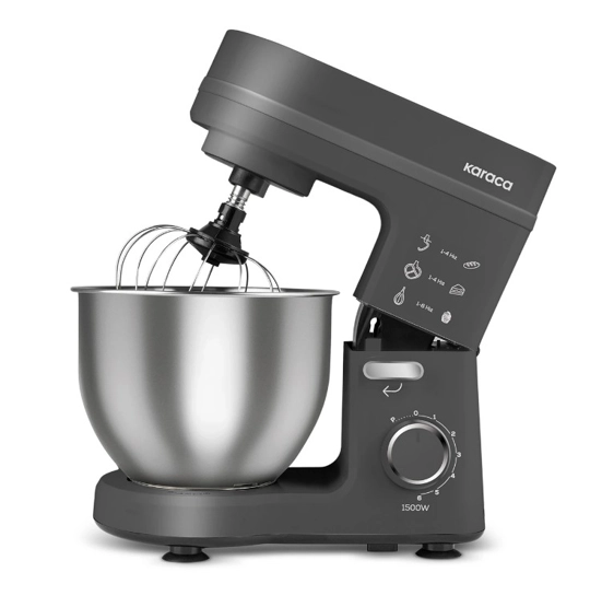 Özellikler 1500W motor gücü ile ideal çırpma, karıştırma ve yoğurma işlemlerini kolaylıkla gerçekleştirir. Yapışmaya karşı dirençli paslanmaz çelik kasesi ile kullanım esnasında müdahaleye gerek kalmadan homojen karışımlar elde edebilirsiniz. Tek hareketle açılabilen oynar başlıklı üst gövde ve güçlü tutucu ayaklar sayesinde hamur maksimum seviyede karışırken bile gövde stabil kalır. Özel tasarım çırpma teli kasenin her yerine ulaşarak hazne içinde gıda kalıntısı bırakmaz, en küçük porsiyonları bile rahatlıkla karıştırabilirsiniz. Aparatları bulaşık makinesinde yıkanabilir. Ek Özellikler 5 L lik geniş kaseye sahiptir. 6 kademeli hız ayarı ve ek pulse fonksiyonu vardır. 3 farklı aparatı ile tüm çırpma, yoğurma ve karıştırma işlemlerinizi rahatlıkla yapabilirsiniz. Hamur kancası ile ekmek, makarna, börek gibi tüm hamur işleriniz için istediğiniz miktar ve kıvamda hamuru yoğurarak mükemmel sonuçlar elde edebilirsiniz. Düz karıştırıcı aparatı ile püre, krep gibi karışımları en ideal kıvamda hazırlayabilirsiniz.