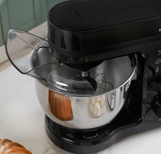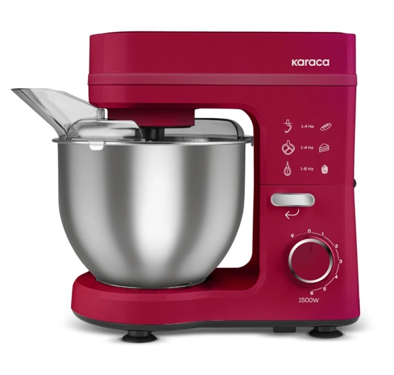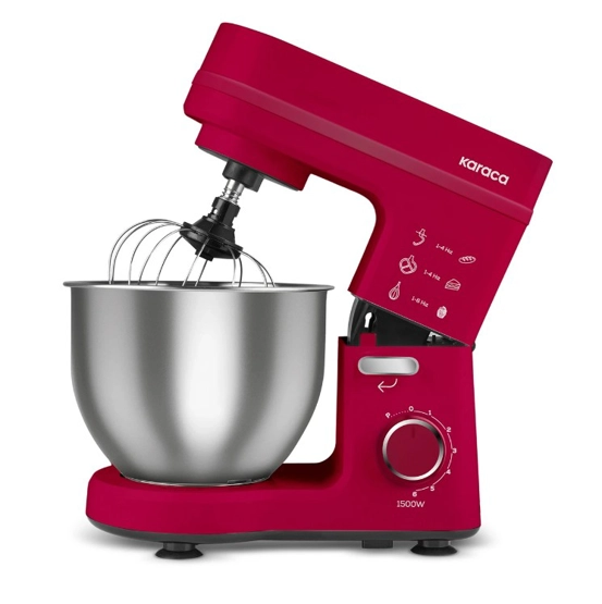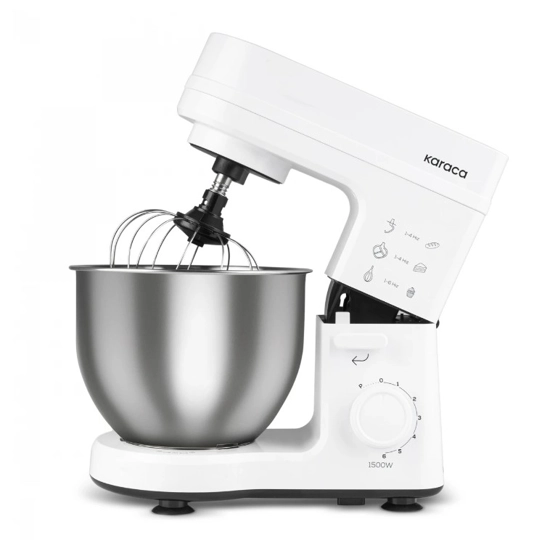 Özellikler 1500W motor gücü ile ideal çırpma, karıştırma ve yoğurma işlemlerini kolaylıkla gerçekleştirir. Yapışmaya karşı dirençli paslanmaz çelik kasesi ile kullanım esnasında müdahaleye gerek kalmadan homojen karışımlar elde edebilirsiniz. Tek hareketle açılabilen oynar başlıklı üst gövde ve güçlü tutucu ayaklar sayesinde hamur maksimum seviyede karışırken bile gövde stabil kalır. Özel tasarım çırpma teli kasenin her yerine ulaşarak hazne içinde gıda kalıntısı bırakmaz, en küçük porsiyonları bile rahatlıkla karıştırabilirsiniz. Aparatları bulaşık makinesinde yıkanabilir. Ek Özellikler 5 L lik geniş kaseye sahiptir. 6 kademeli hız ayarı ve ek pulse fonksiyonu vardır. 3 farklı aparatı ile tüm çırpma, yoğurma ve karıştırma işlemlerinizi rahatlıkla yapabilirsiniz. Hamur kancası ile ekmek, makarna, börek gibi tüm hamur işleriniz için istediğiniz miktar ve kıvamda hamuru yoğurarak mükemmel sonuçlar elde edebilirsiniz. Düz karıştırıcı aparatı ile püre, krep gibi karışımları en ideal kıvamda hazırlayabilirsiniz.