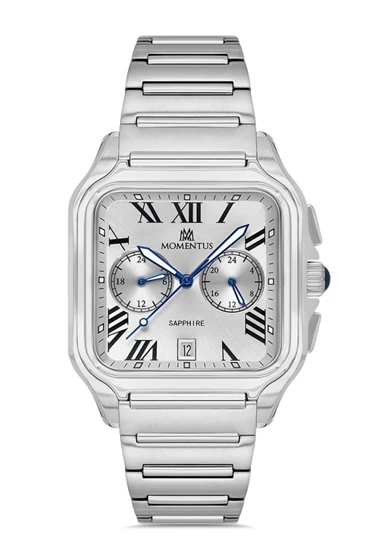 Momentus TM348S-02SS Safir Camlı Kare Kadranlı Çelik Kordon Çelik Kasa 5 ATM Suya Dayanıklı Metal Renk Kadın Kol Saati