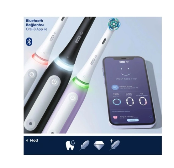 Oral-B’nin en iyi teknolojisine sahip olan iO 4 şarjlı diş fırçası, evde sansasiOnel bir temizlik hissi için diş hekimlerinden ilham alan yuvarlak fırça başlığını mikro titreşimli fırça kıllarıyla birleştirir. Akıllı Basınç Sensörü diş etlerinizi daha iyi korumak için dişlerinizi fazla sert veya fazla yumuşak fırçalamanızı engeller. Diş Eti Koruyucu, diş fırçalarken çok fazla basınç uyguladığınız zaman sizi uyarır. En iyi sonuç için Oral-B iO diş fırçası başlığınızı 3 ayda bir değiştirin. SansasiOnel arındırıcı bir temizlik hissi ve hassas fırçalama deneyimi için DEVRİM YARATAN iO TEKNOLOJİSİ ile Oral-B’nin ŞU ANA KADARKİ EN İYİ TEMİZLİĞİ Normal manuel diş fırçasına kıyasla bir haftada ferah, temiz ağız hissi ve %100 daha sağlıklı diş etleri için Oral-B’nin benzersiz yuvarlak fırça başlığını hassas mikro titreşimlerle birleştirir Fırçalamanızı kişiselleştirmek için 4 FIRÇALAMA MODU: Günlük Temizlik, Beyazlatma, Hassas, Süper Hassas