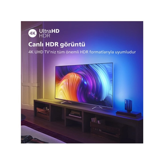 Philips 58PUS8507 58" 147 Ekran Uydu Alıcılı 4K Ultra HD Ambilight Smart LED TV Philips 58PUS8507 58" 147 Ekran Uydu Alıcılı 4K Ultra HD Android Smart LED TV ses ve görüntü sistemleri kategorisi altında yer alır. Philips 147 ekran TV 58 inç ekrana sahiptir. Philips 147 ekran televizyon, 3 taraflı ambilight özelliği ile kullanıcılarına 4K UHD LED deneyimi sunar. Ambilight ile televizyonun kenarındaki led ışıklar parlayarak ekrandaki görüntünün renkleri ve ekrandaki ses ile uyumlu olarak renk değiştirir. Philips 58 ekran TV, P5 motoru ile görüntüleri daha parlak hale getirir. Ayrıntıların gözle görülmesini sağlar. Ekrandaki görüntülere daha çok derinlik kazandırır. Philips 58PUS8507 58" 147 ekran TV Özellikleri Philips 58PUS8507 58" 147 ekran neredeyse çerçevesiz bir tasarıma sahiptir. Her iç mekana uygun bir tasarımı vardır. Philips 4K UHD TV bilinen bütün HDR formatları ile entegredir. Bu sayede kaliteli ve net görüntüler elde edilir. Ortamın aydınlık veya karanlık olmasından etkilenmeyerek her ayrıntıyı gösterir. Philips TV smart teknolojisine sahiptir. Bu sayede TV ile internete bağlanılır. Çeşitli platformlardan programlar izlenir, internette tarama yapılır, diğer teknolojik cihazlar ile bağlantılar kurulur. TV’de bulunan platformlar ile birlikte tercih edilen platformlara da smart ile giriş yapılır. Smart ile dış bağlantılar kurulur ve izlenmek istenen programları ekrana yansıtılır. Philips 58PUS8507 TV Avantajları Philips TV dolby vision ve dolby atmos ile karanlık ışığa sahip film, dizi ve oyunların görüntüsü iyileştirilir ve parlaklığı artırılır. Android TV ile istenilen içeriğe erişilir. Ana ekran kişiselleştirilerek kullanılır. Philips televizyonun sesli komut özelliği vardır. Sesli komut ile Google Asistan ile bağlantı kurularak komutlar verilir. Stand genişliği soundbar kullanmaya uygun hale getirilir. DTS Play-Fi tarafından desteklenen Philips Kablosuz Ev Sistemi ile soundbarlar ile hoparlörlerle bağlantı kurularak televizyon, ses sistemi olarak da kullanılır. Philips televizyon dizi ya da film izlemenin dışında oyun oynayanlar için de ayrı bir deneyim sağlar. HDMI 2.1 ve VRR destekli bir sistemi vardır. Bu sayede oyun konsolu açıldığında TV kendiliğinden ultra düşük gecikme süresi ayarına gelerek seri bir oyun deneyimi sağlar. Ayrıyeten ambilightın oyun modu ile görsel olarak da ayrı bir deneyim sağlanır.
