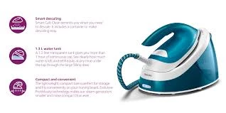 Philips ütü sıfır yanık garantisiyle giysileri koruma altına alır. Dikey buharlı ütü OptimalTEMP teknolojisi ile ısı ayarı gerektirmeden kullanılır. Philips GC6815/20 ütü üstün kırışıklık giderme özelliğiyle ultra güçlü buhar uygular. Philips SteamGlide ütünün tabanının kaygan olmasını sağlayan bir teknolojidir. Bu sayede çok daha verimli sonuçlar elde edilir. Otomatik kapanma ütünün önemli özellikleri arasında yer alır. Yanık riskini ortadan kaldırır. Philips GC6815/20 PerfectCare Compact Essential 2400w buhar kazanlı ütü kartuş gerektirmeyen kireç temizleme haznesi ile kendi bakımını yapar. GC6815/20 Philips ütü hafif ve kompakt yapısı ile kullanım kolaylığı sunar. 2400 watt ütü güçlü ve yüksek performanslı ütüleme esnasında enerji tasarrufu sağlar. Philips ütü GC6815/20 Essential buhar kazanlı ütü 1.3 litrelik su haznesi ile daha uzun ütüleme süresi elde eder. Buhar istasyonlu ütünün güç kablosu uzunluğu 1.65 metredir. Bu sayede geniş kullanım alanına sahiptir. Şok buhar kazanlı ütü ipek gibi hassas kumaşlarda dahi etkili sonuçlar gösterir. Sürekli buhar veren ütü kablo ve hortum saklama bölmesi sayesinde yer kaplamaz.